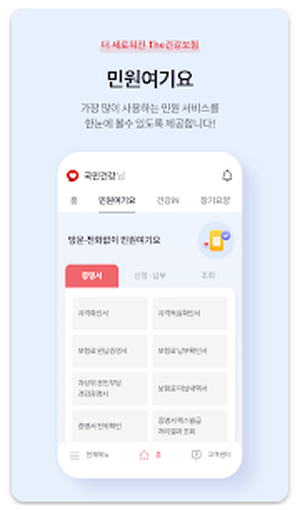 더 건강한 국민의 삶을 위해 모바일로 편리하게 민원서비스를 이용하세요. 1. 민원여기요 - 자격득실확인서, 보험료 납부확인서 등 증명서 5종을 제출기관에 팩스로 보낼 수 있습니다. - 보험