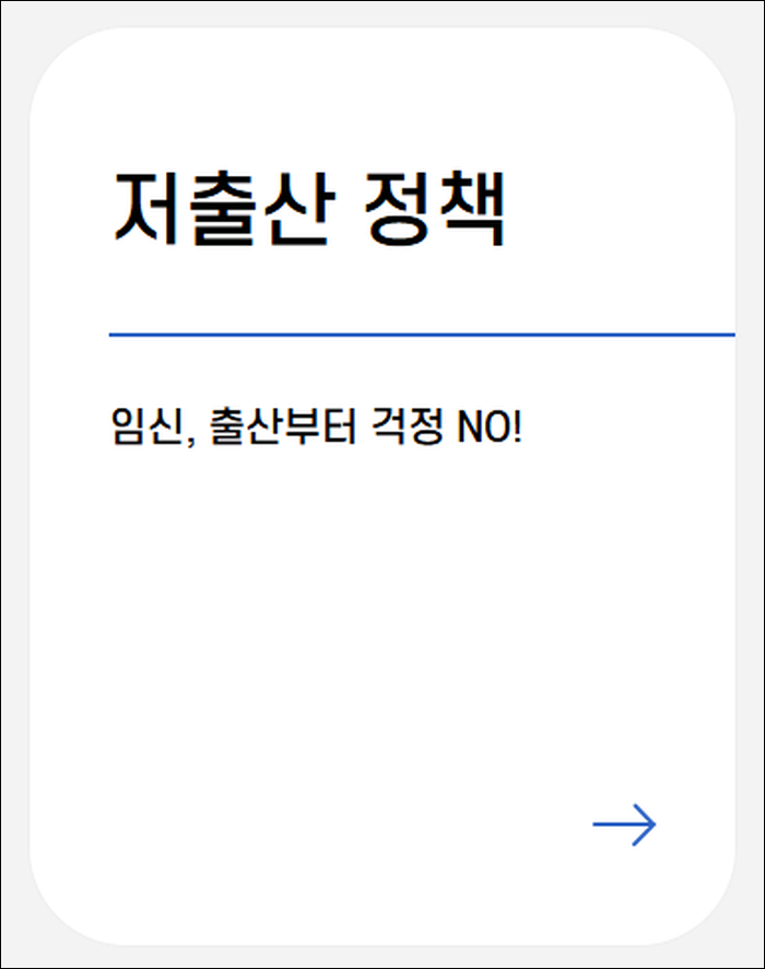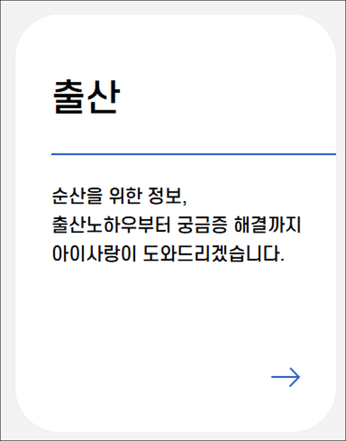 - 임신, 출산, 육아 관련 최신 정보 제공 시기별로 필요한 건강관리, 교육, 영양 관련 정보와 함께 관련 제도에 대한 안내도 제공됩니다.