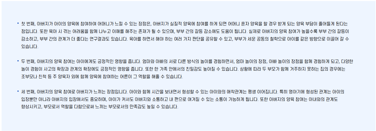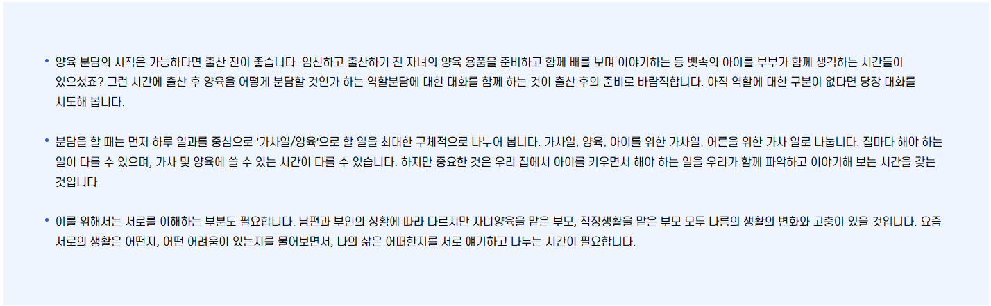 - 영양 및 건강 관리 정보 시기별 영양 가이드, 예방접종 정보, 유아기 건강 체크리스트 등을 제공해 부모가 자녀의 건강을 체계적으로 관리할 수 있도록 돕습니다.