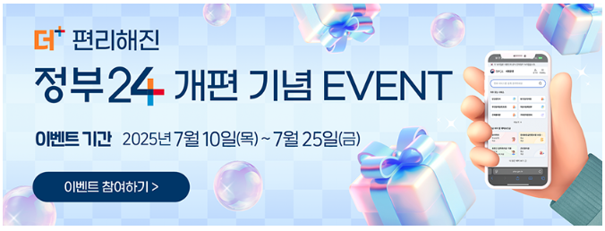 정부24는 정부의 서비스, 민원, 보조금24, 정책·정보를 통합 제공하는 대한민국 정부 대표포털 입니다.