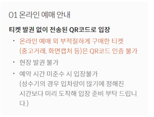 - 온라인 예매 외 부적절하게 구매한 티켓 (중고거래, 화면캡처 등)은 QR코드 인증 불가