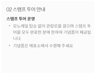 - 모노레일 탑승 없이 관람로를 걸으며 스탬프 투어를 모두 완료한 분에 한하여 기념품이 제공됩니다.